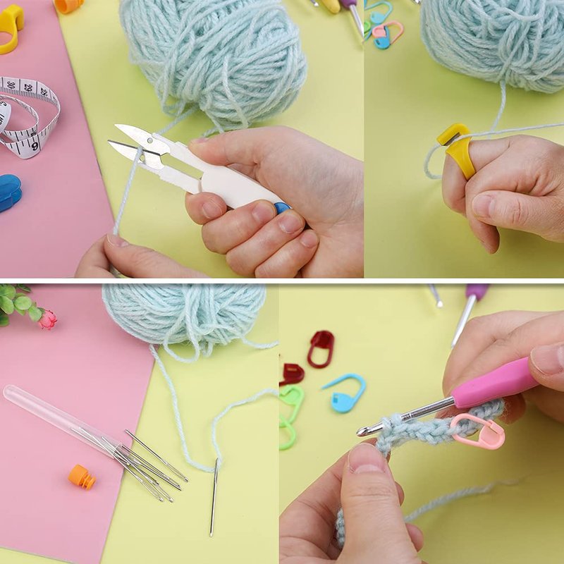 Package: 1 Pcs Scissors 10 Pcs Mark pin 1 Pcs Ring Cutter 1 Pcs Row Counter 2 Pcs Tapestry Needle 9 Pcs Steel blunt Needles 13 Pcs colorful rubber handle Hooks 1 Pcs Lovely Storage Bag