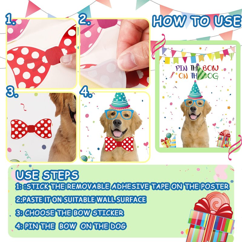 - Simple and Easy to Play: pin the bow game is easy to understand, first stick the dog poster on the wall, draw a line on the floor, then each player chooses a sticker and try to paste it on the corresponding position on the poster, the player with the most accurate position wins
