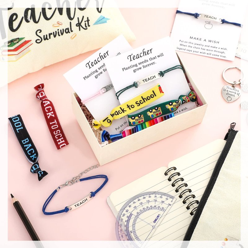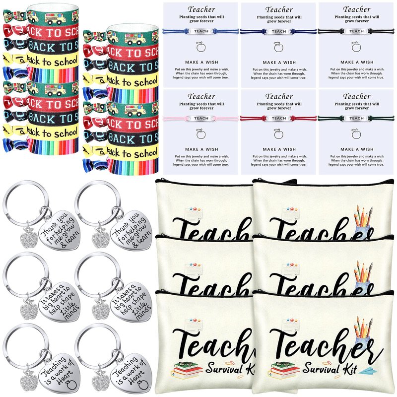 - Teacher Present Set: there are 38 pieces teacher appreciation gifts in our package in total, including 6 pieces teacher makeup bags, 20 pieces makeup hair ties in 5 styles, 6 pieces teach blessing card bracelets in 6 styles, 6 pieces teacher key chains in 3 styles, sufficient to use