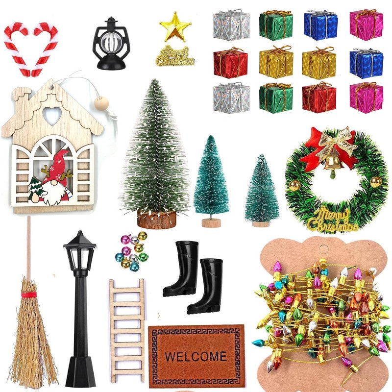 - 【MINI FAIRY DOOR KIT】the package comes with 39 pieces miniature dollhouse Christmas accessories, including 5 meters long string of lights1 Miniature Christmas Wreath1 Miniature Broom1 Miniature Vintage Fake Lantern1 street lamp1 Miniature Wooden Ladder1 Miniature "Welcome" Printed Door Mat3Miniature Christmas Trees1 Pair of Miniature Black Booties10 mini bells12 gift boxes2 walking sticks1 Tree top star1 Merry Christmas1 door
