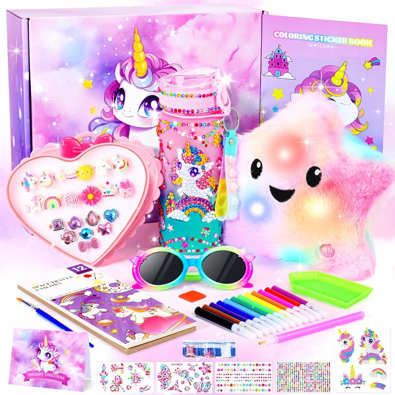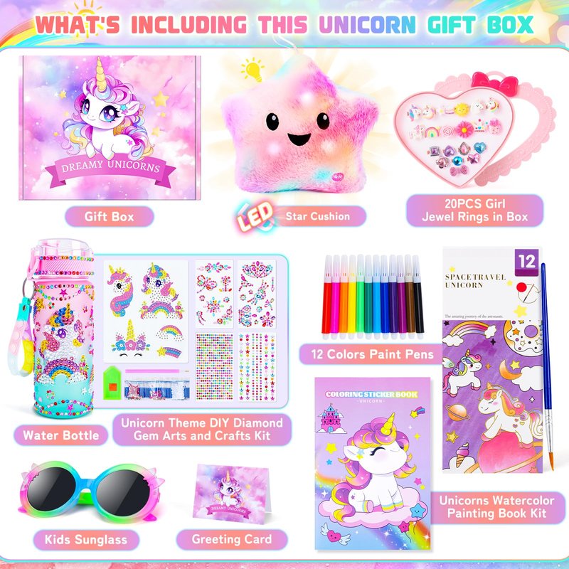- 39PCS UNICORNS GIFT FOR GIRLS - Our unicorn toys gift set fits girls aged 3-8 Including LED Unicorn Star Cushion,Unicorn Theme DIY Diamond Gem Arts and Crafts Kit, 12 Colors Paint Pens, 20PCS Girl Jewel Rings in Box,Unicorns Watercolor Painting Book Kit and Kids Sunglass. Greeting Card,crystal Unicorn toys set is perfect Christmas gift for girls, girls birthday gifts for 6 7 8 9 10-12 year old, Children's day gift, girls toys.