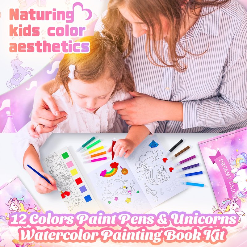 - EDUCATIONAL CRAFT KIT FOR GIRLS-With this water bottle kit, girls use their imagination to create their own personalized bottles. The 12 Colors Paint Pens and Unicorns Watercolor Painting Book Kit also in the unicorn set,your girl can use this paint sets to paint, write, or add a splash of vibrant color to any art and craft project. This not only diffusive thinking, but also improves their hands-on ability and motor skill, etc.