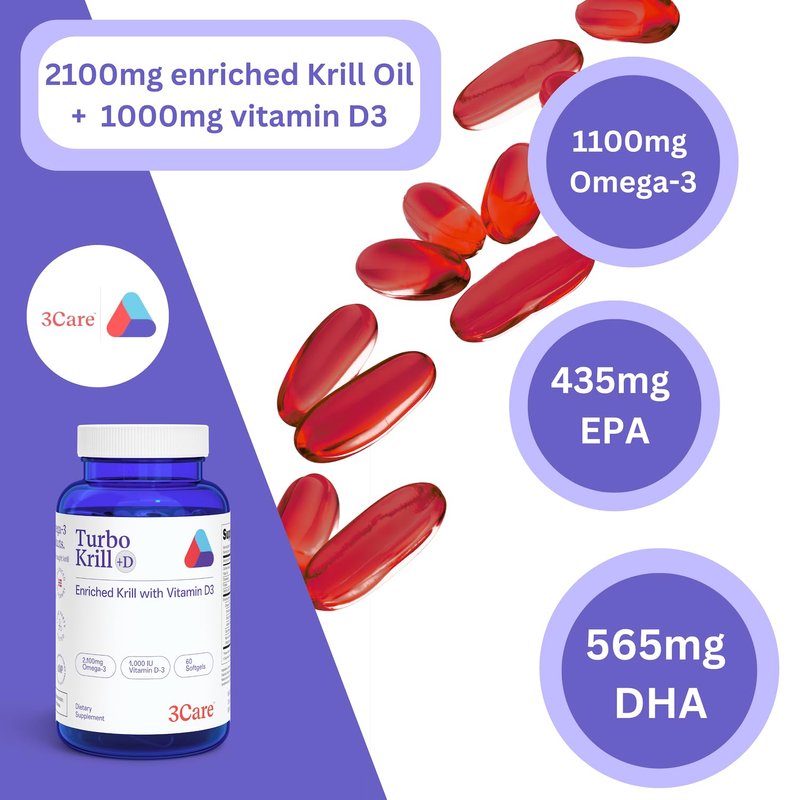 3Care Turbo Krill 2100mg [High Concentrate] Krill Oil Plus 600 IU Vitamin D-3 Cholecalciferol and Astaxanthin Omega 3 Supplement 60 Count Softgel