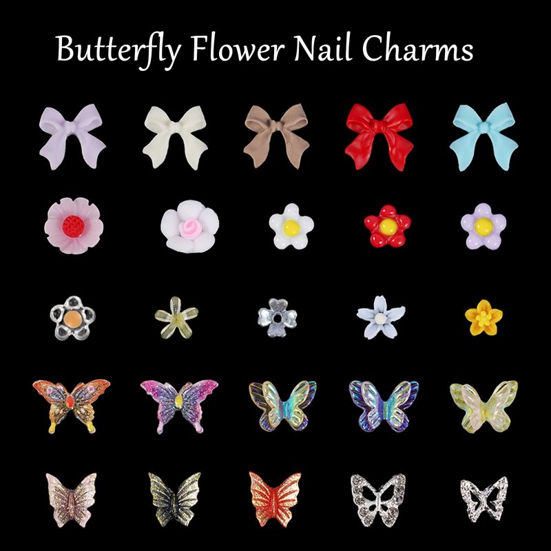 This set is mixed with different colors, shapes and sizes of shiny acrylic flower/ butterfly/ bowknot charms. There are so many choices for your nail work, which is suitable for different occasions such as weddings, parties, datings, adding elegance and glamour to your nails.