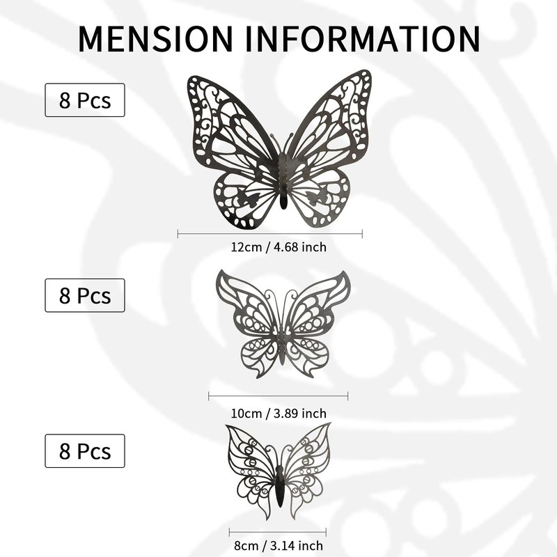 - 【Package Included】You will get 24pcs 3D butterfly stickers in 3 different sizes, including 8pcs 8cm/ 3.14 inch for minimum size, 8pcs 10cm / 3.89 inch for middle size, and 8pcs 12cm / 4.68 inch for maximum size. Coming with 24 pcs double-sided adhesive dots.