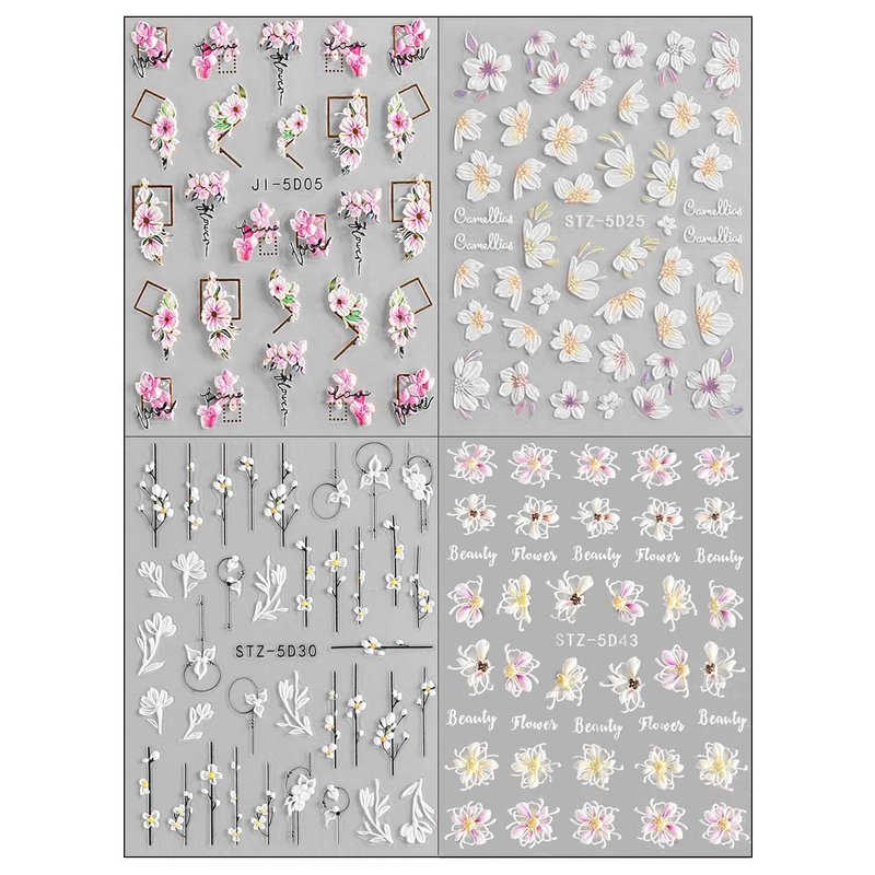 3D Embossed Flower Nail Art Stickers Decals Self-Adhesive Pegatinas Uñas 5D Floral Nail Supplies Nail Art Design Decoration Accessories 4 Sheets