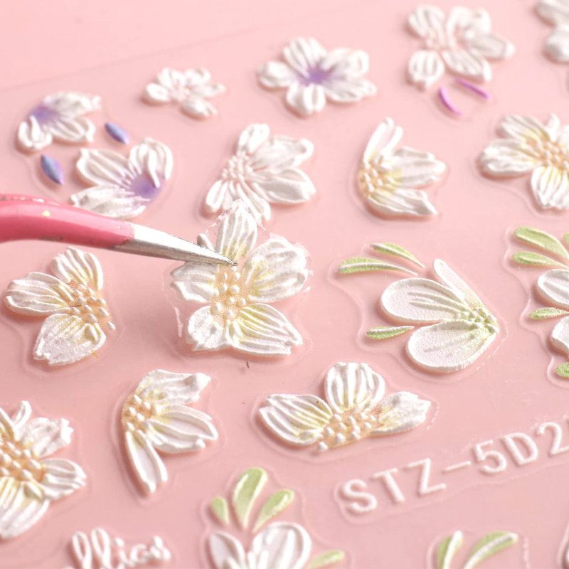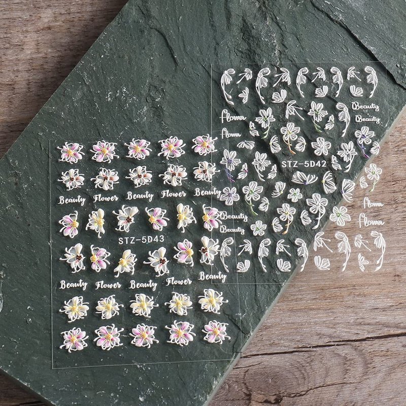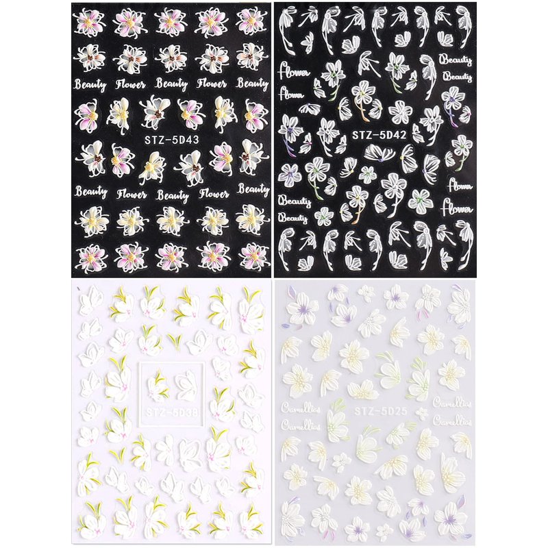 3D Embossed Spring Flower Nail Art Stickers Decals 4 Sheets 5D Self-Adhesive Pegatinas Uñas Pink Cherry Blossoms Floral Nail Supplies Nail Art Design Decoration Accessories