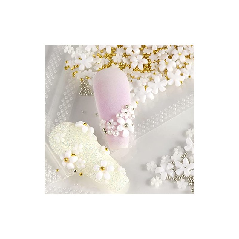 3D Flower Caviar Beads Nail Art Decals Charms for Nails, White Pink 3D Acrylic Flower Nail Charms with Pearl Golden Caviar Beads for Women DIY Manicures Salon Accessories
