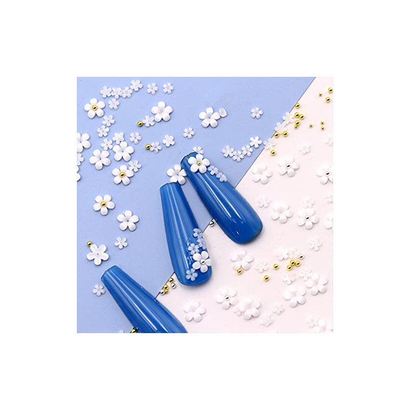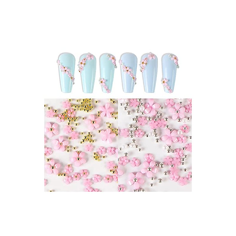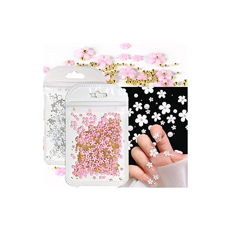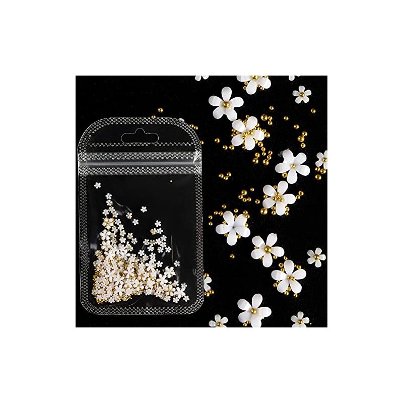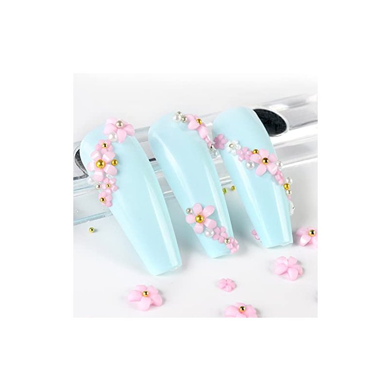 White Pink 3D Acrylic Flower Nail Charms With Pearl Golden Caviar Beads Nail Art Accessories Nail Designs for DIY Nail Decorations Nail Art Supplies
