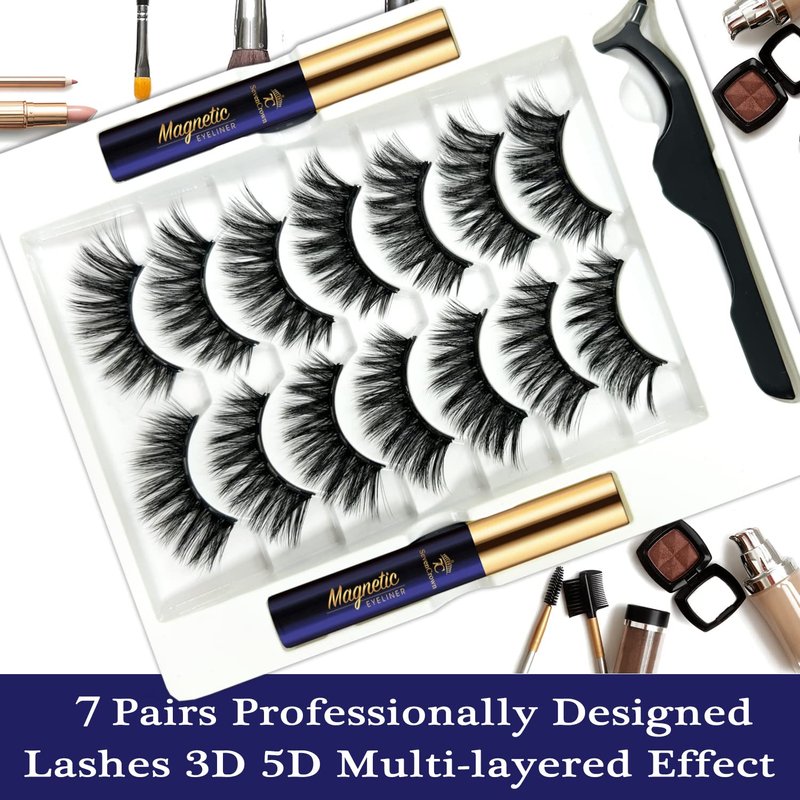 3D Magnetic Eyelashes with Eyeliner Kit - 7C SevenCrown Magnetic Lashes Natural Looking with Upgraded 2 Tubes of Magnetic Liner Waterproof, Long Lasting,7 Pairs Reusable False Eyelashes Easy to Apply.