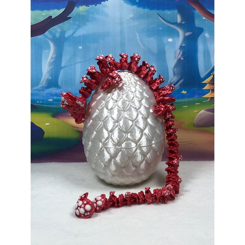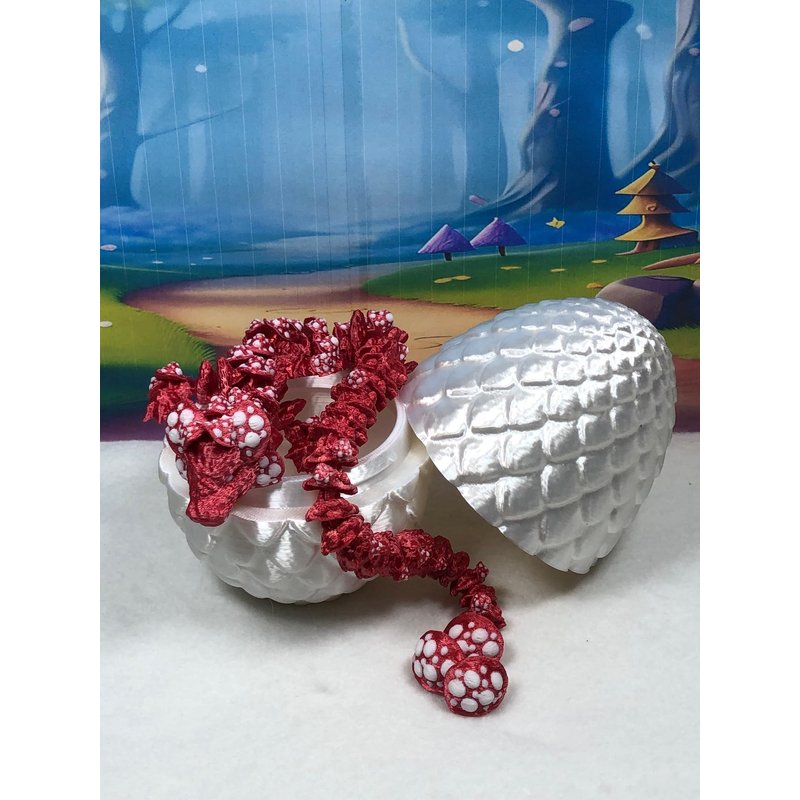 3D Printed enchanting Articulated Cherry Blossom Dragon - a mystical creature that brings a touch of fantasy to your world. Unveil the mystery of the WHITE Dragon Egg and this Red and White Mushroom Dragon ( measures approximately 12" long) a captivating fusion of elegance and fantasy. Encased within a meticulously designed crystal egg, this tiny dragon reveals itself with a symphony of colors - a testament to its magical heritage. ------- Choking Hazard Small Components Advisory NOT for Children under 3 years old: ------- Please note that this product may contain small components and might not be suitable for very young children. Given the characteristics of 3D printing, there is a potential for small components to detach if handled aggressively or dropped. Therefore, we advise against allowing younger children to interact with the dragon. Please consider that 3D printed objects might include minor imperfections such as layer lines. These are a natural and inherent aspect of the printing process. We strive to produce the highest quality items, and these imperfections contribute to the unique character of each piece. Recall the unique creation of each dragon, crafted exclusively for you. The color selections available are depicted in the provided photos. Please be aware that variations in color may occur due to discrepancies in filament production and the characteristics of the monitor or screen you are utilizing to view the listing. Additionally, the arrangement of prints using multi-colored filament rolls can influence color distribution. ------- Licensing Information: ------- Authorized Design: NOHo3D holds the official authorization for the production of this exquisite design created by CinderWing3D.