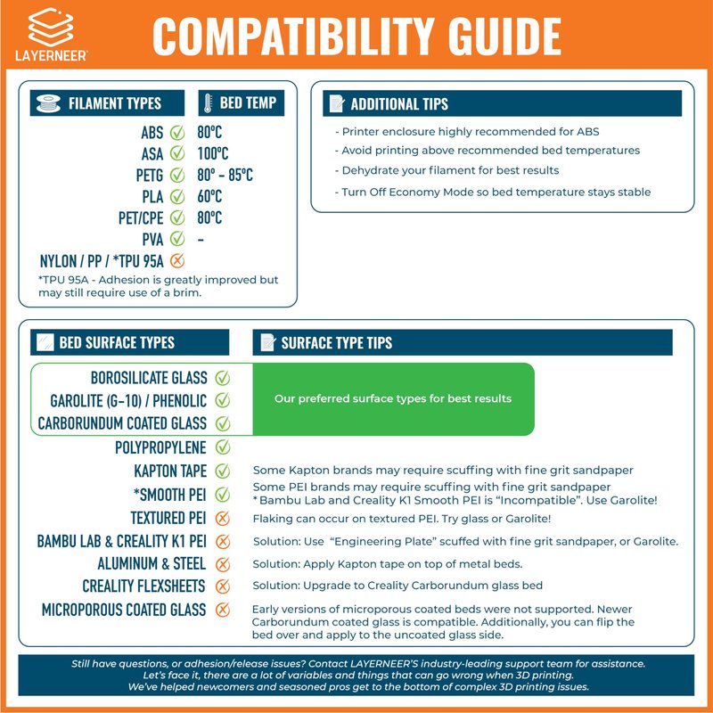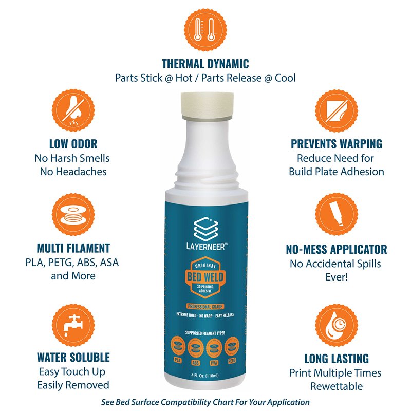 Do you have trouble with parts warping or detaching from your printer bed? Have you struggled with part removal after your print is finished?INTRODUCING LAYERNEER BED WELD! BED WELD is engineered to solve these challenges by enhancing your print surface. It grabs hold of that critical first layer when your build surface is hot and refuses to let go with its gecko-like grip. In many cases, you can print without rafts or brims, saving you time and material.Once your print finishes, let your bed cool to room temperature. As it cools, Bed Weld releases its hold, so you don't have to wrestle to get your part off. Typically, your part will fully detach without needing tools.BED WELD comes with a unique applicator that makes applying the coating a simple no mess process. The coating dries quickly when the bed is heated. It forms a thin film that is "not sticky", yet parts will adhere well to it. NOTE: BED WELD was designed for use with heated build plates made from glass. Applying to glass build plates is preferred. See "Compatibility Guide" image for a full list of supported built plate surfaces.Creality flexible magnetic sheets, textured PEI, spring steel, and aluminum surfaces are not supported.Works with PLA, ABS, PETG, ASA, and CPE filaments. BED WELD is not recommended for use with Nylon, PP, or TPU 95A.See "Compatibility Guide" image for a full list of supported filament types.PRINTING TIPS: When printing with ABS, we recommend setting your bed temperature no higher than 80C, and using an enclosure.Turn off printers "Economy" mode so your bed temperature remains stable throughout the print.BED WELD is backed by an unconditional 90-Day money-back manufacturer guarantee, so you risk nothing!