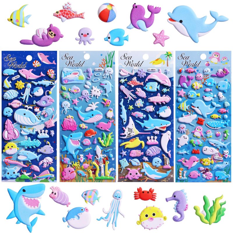 - 【Package Contents】Enhance the fun of kids' parties with our Ocean Life Foam Stickers Set, featuring 4 sheets of adorable marine animal stickers with approximately 140 3D fluffy designs. Kids will love the variety of sea creatures like whales, dolphins, octopuses, sharks, jellyfish, and crabs.