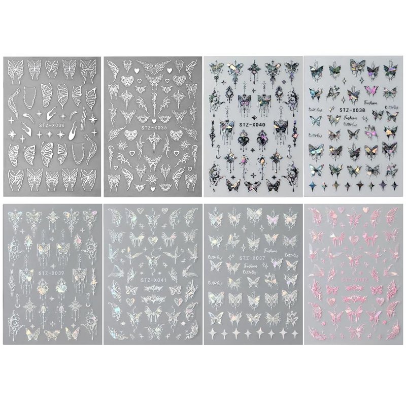 - 【8 Sheets Butterfly Nail Stickers】You will get 8 sheets of butterfly nail art stickers in different designs, each with multiple patterns, and their rich patterns offering endless possibilities for your nail art. The size of the entire sticker is approximately 9.5x6.5 cm/3.74x2.56 inches.