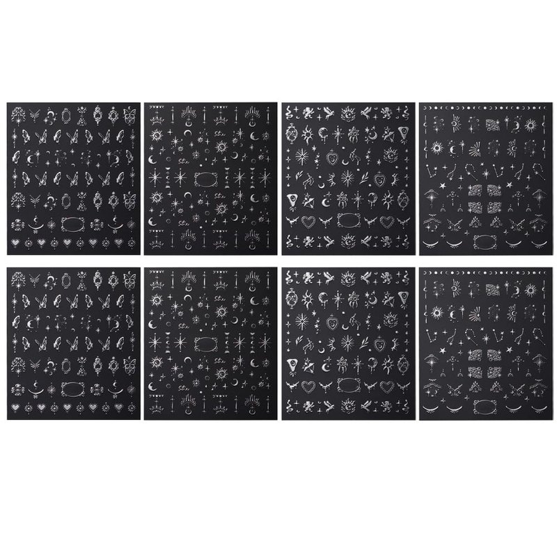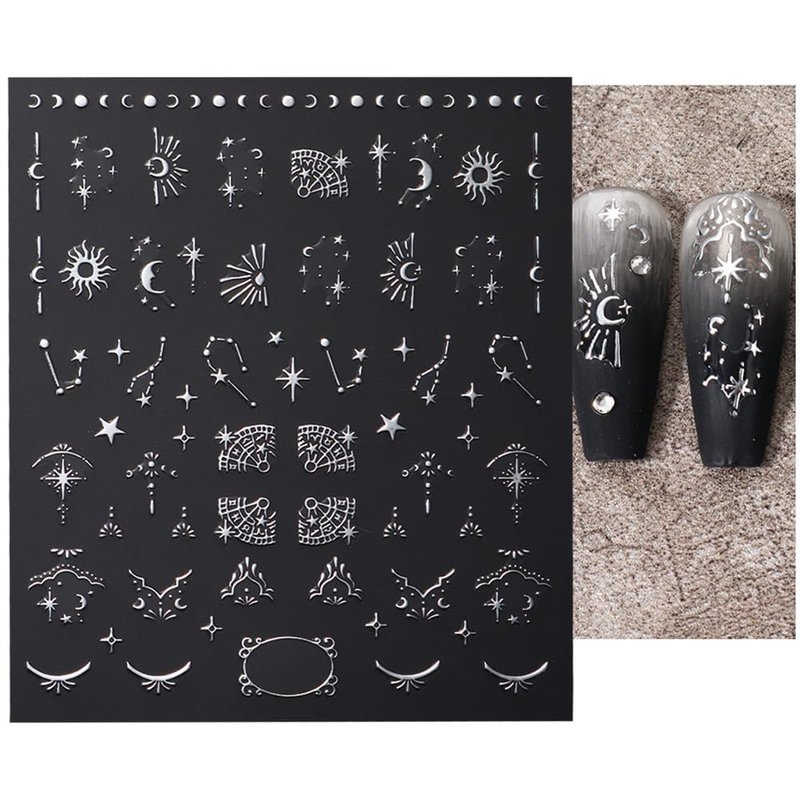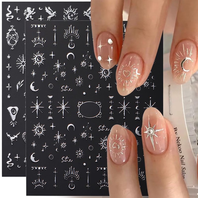 - 🌟【Rich Patterns】These metallic silver nail stickers come in a variety of pattern designs such as stars, moon, sun, starlight, snakes, constellations, planets, hearts, butterflies, pegasus, necklaces, bohemian totems and more.