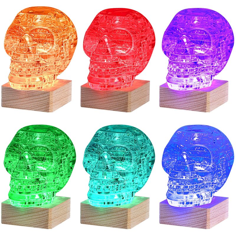 Features: 1. Environment-friendly, Safe, and Non-toxic.No tools required (No need for Cutter / Glue). 2. Compare with a traditional puzzle, it has a more three-dimensional sense and realism. 3. Stimulates children's brain development by assembling these fun 3d crystal jigsaw puzzles, which develop the thinking skill, logic sense, and hands-on ability of children. 4. Place a 3D skull model on the desk of the office or living room will add more beautiful and bright colors to your surroundings. It is not only very suitable for adults to relieve stress after work but also good for the elderly to keep exercising the brain. 5. The wooden light base has 7 colors, which automatically cycle color change. Specifications: Material: plastic Total Quantity: 49pcs Size of the finished product: 4.33 * 2.95 * 2.95 in Color: Grey Note: 1. This product is only suitable for 14 years old or above. 2. This product has small parts &sharp points, please handle with care while matching. 3. Small parts caused the choking hazards.