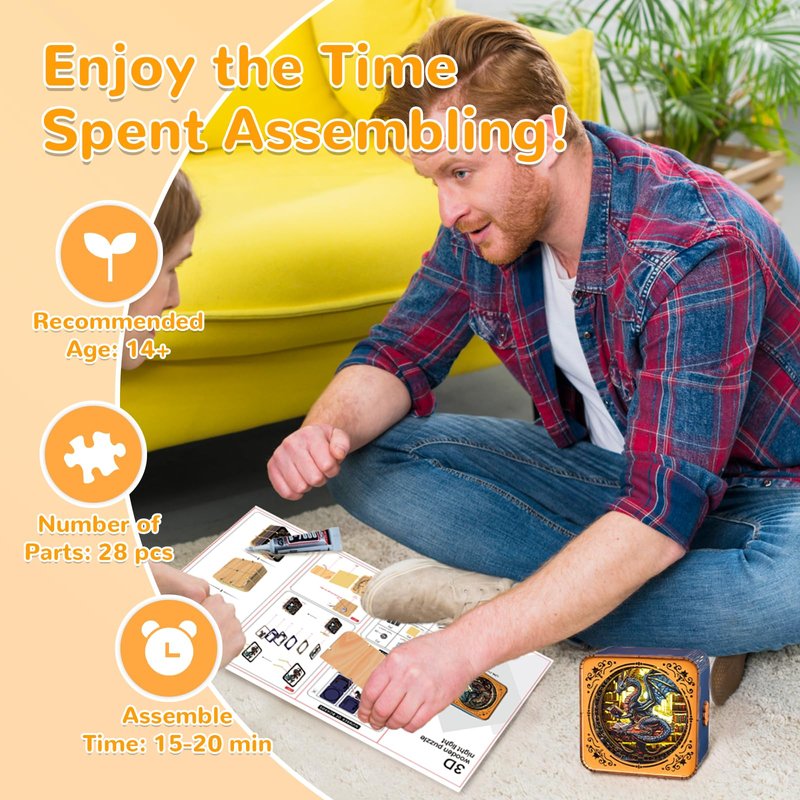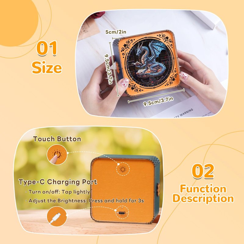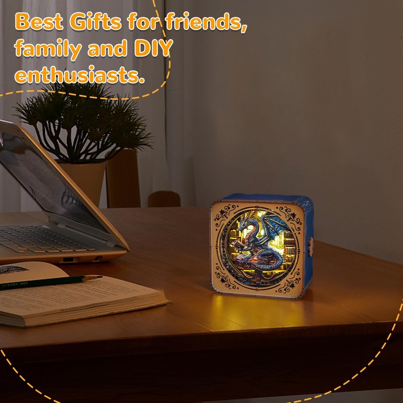 3D Wooden Puzzle Night Light, Library Dragon DIY Puzzles for Adults, Eye Care Night Light with Touchable Switch, Personalized Gifts for Family Friend DIY Puzzle Lover
