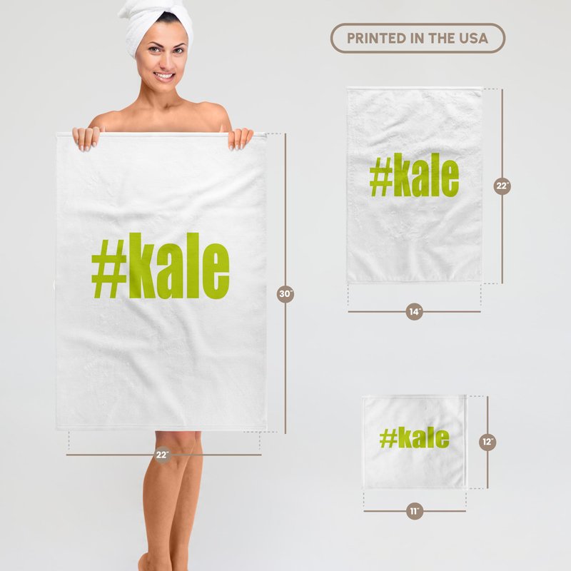 Green #Kale on white background Towel is great to use in the kitchen, bathroom or gym. This 15 by 22 inch, hand/sports towel allows you to customize your room with a special design or color. Great for drying dishes, hands and faces. Suitable to put in any sports bag. Image will not fade after washing. Machine wash, tumble dry low, do not bleach. Towel will regain its fullness after the first washing. Made of: Printed side 100% polyester and reverse side 100% Terrycloth cotton. Image printed on polyester side/ terry cloth side is blank white.