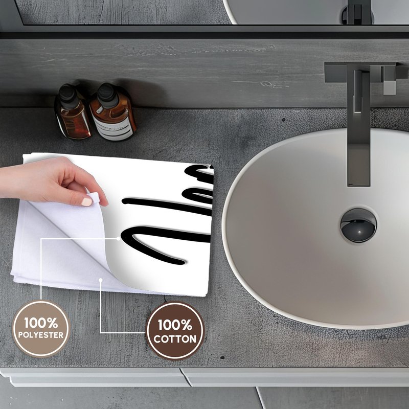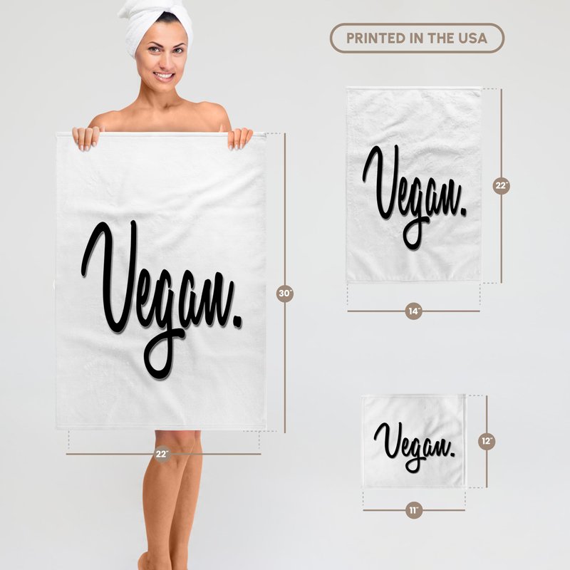 PRINT OF TEXT VEGAN, BLACK Towel is great to use in the kitchen, bathroom or gym. This 15 by 22 inch, hand/sports towel allows you to customize your room with a special design or color. Great for drying dishes, hands and faces. Suitable to put in any sports bag. Image will not fade after washing. Machine wash, tumble dry low, do not bleach. Towel will regain its fullness after the first washing. Made of: Printed side 100% polyester and reverse side 100% Terrycloth cotton. Image printed on polyester side/ terry cloth side is blank white.
