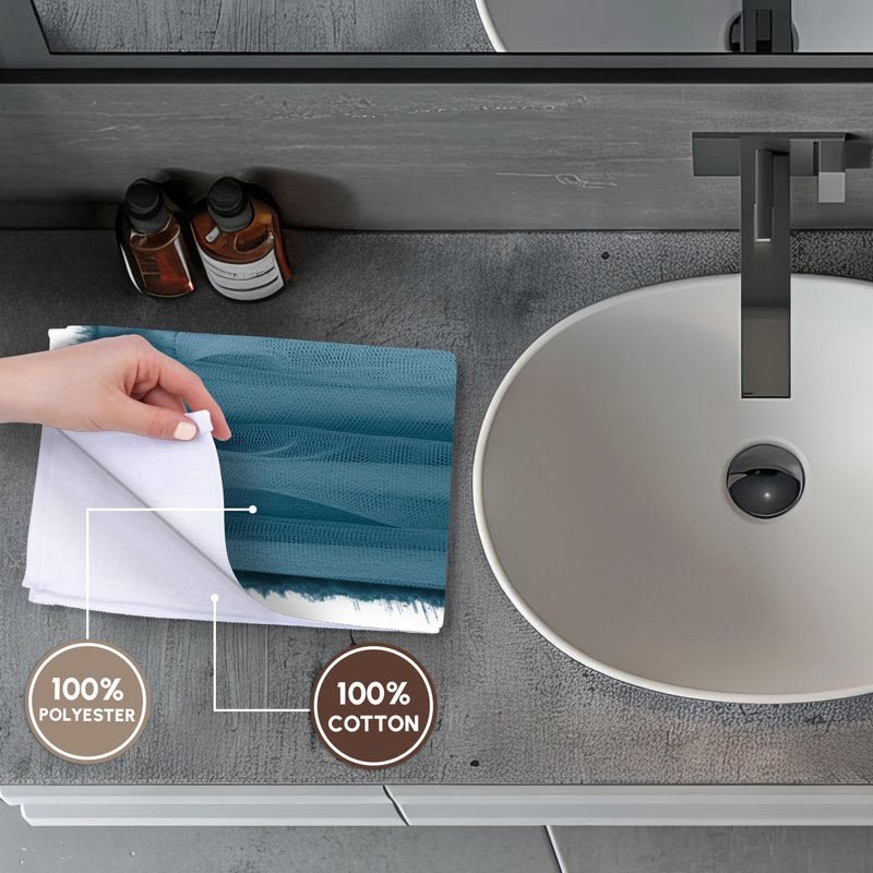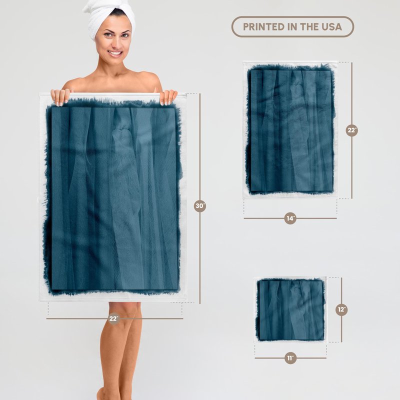 Blue summer dresses on display in a row. Digital cyanotype art Towel is great to use in the kitchen, bathroom or gym. This 15 by 22 inch, hand/sports towel allows you to customize your room with a special design or color. Great for drying dishes, hands and faces. Suitable to put in any sports bag. Image will not fade after washing. Machine wash, tumble dry low, do not bleach. Towel will regain its fullness after the first washing. Made of: Printed side 100% polyester and reverse side 100% Terrycloth cotton. Image printed on polyester side/ terry cloth side is blank white.