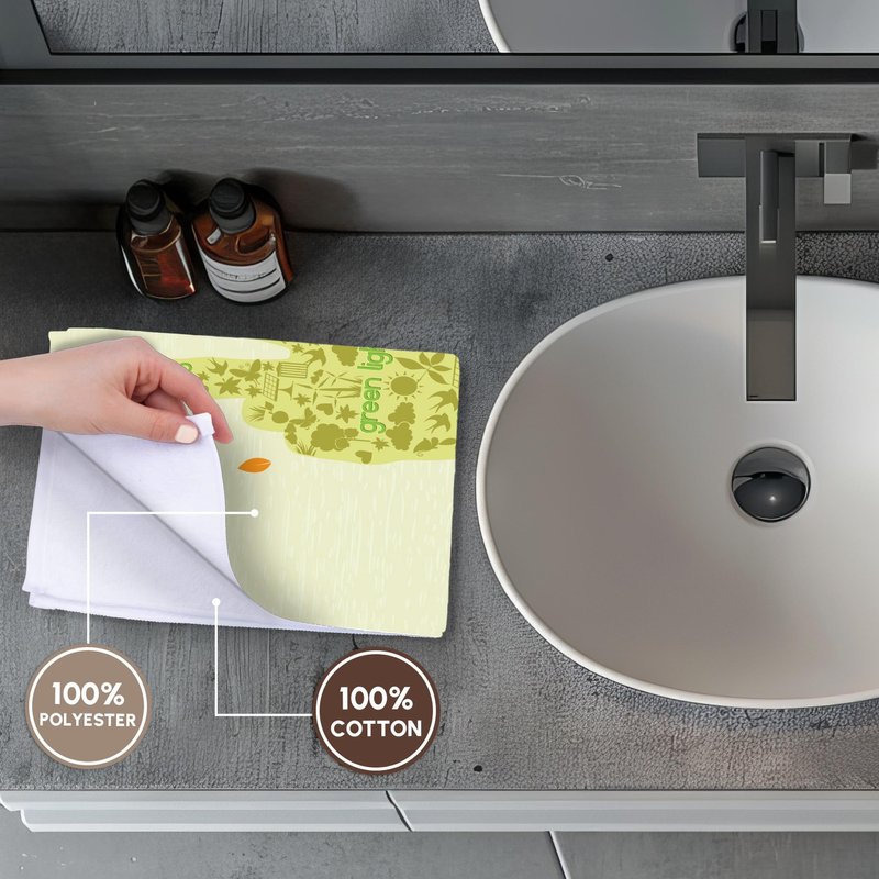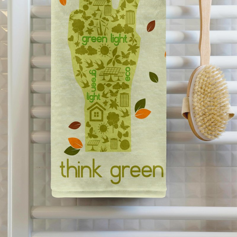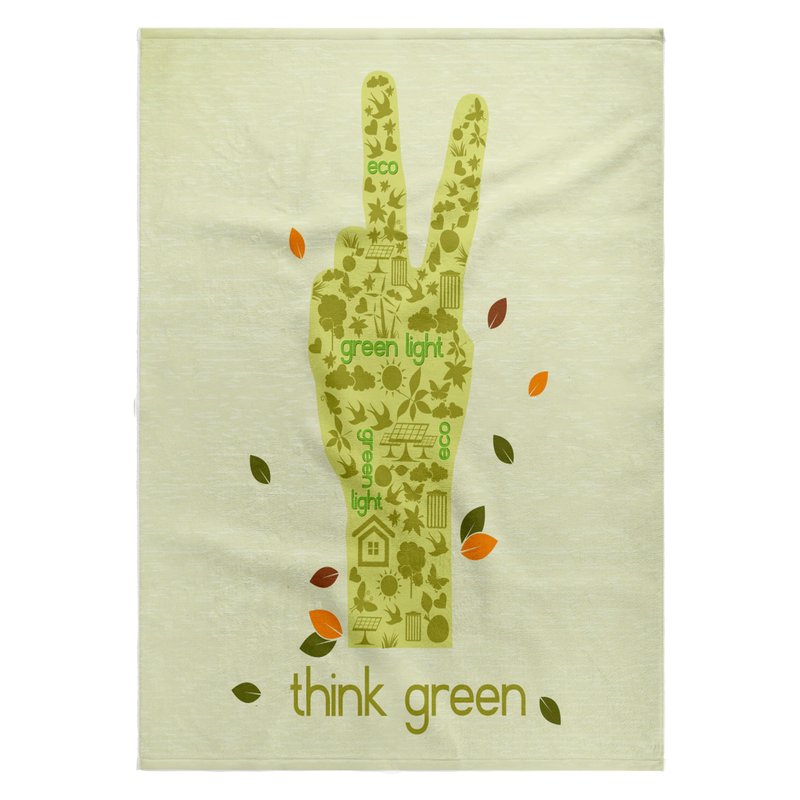 Earth Day Eco-Friendly Environmental Peace Hand Think Green Towel is great to use in the kitchen, bathroom or gym. This 15 by 22 inch, hand/sports towel allows you to customize your room with a special design or color. Great for drying dishes, hands and faces. Suitable to put in any sports bag. Image will not fade after washing. Machine wash, tumble dry low, do not bleach. Towel will regain its fullness after the first washing. Made of: Printed side 100% polyester and reverse side 100% Terrycloth cotton. Image printed on polyester side/ terry cloth side is blank white.