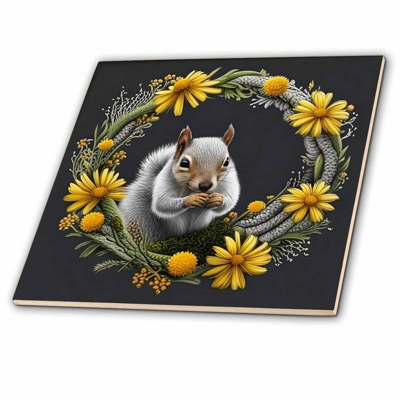 3dRose Gray Squirrel with Yellow Flower Wreath Kentucky State Tattoo Art - Tiles (ct-384700-6)
