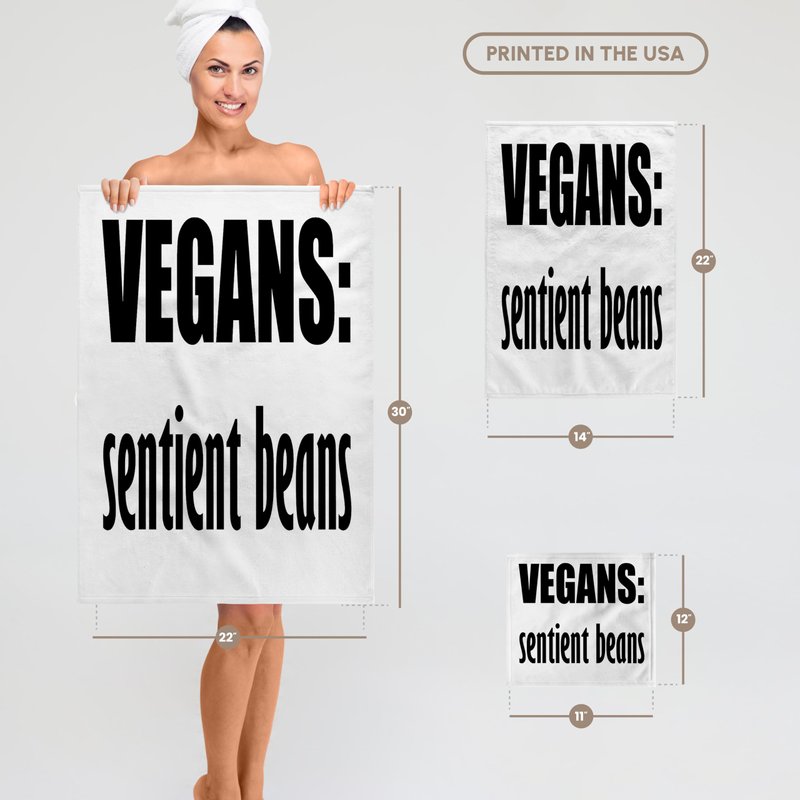Vegans - Sentient Beans Towel is great to use in the kitchen, bathroom or gym. This 15 by 22 inch, hand/sports towel allows you to customize your room with a special design or color. Great for drying dishes, hands and faces. Suitable to put in any sports bag. Image will not fade after washing. Machine wash, tumble dry low, do not bleach. Towel will regain its fullness after the first washing. Made of: Printed side 100% polyester and reverse side 100% Terrycloth cotton. Image printed on polyester side/ terry cloth side is blank white.