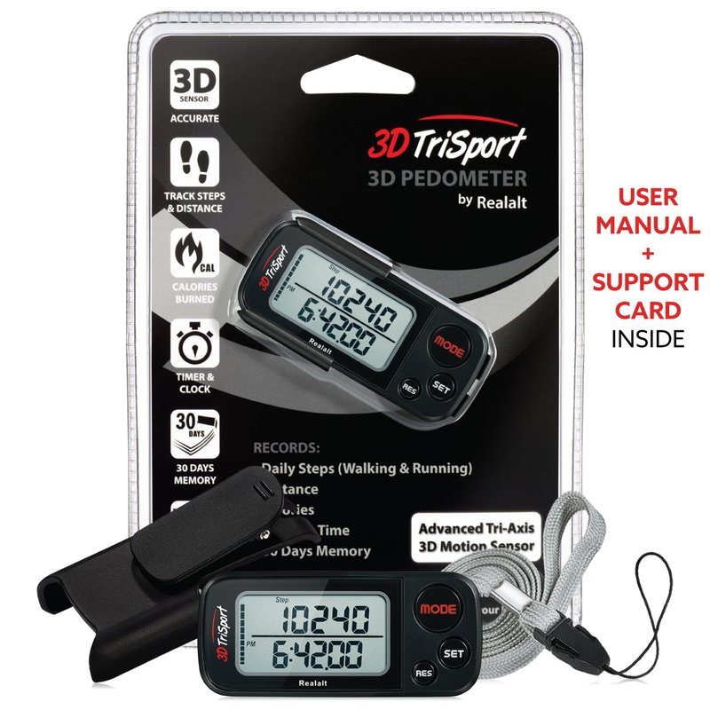 - ACCURATELY TRACK YOUR ACTIVITY – The 3DTriSport Walking 3D Pedometer uses the latest 3D Tri-Axis Sensor Technology to Track your Daily Activity with Superb Accuracy. Records your Steps (Walking & Running), Distance (Km & Miles), Calories Burned and Exercise Time. It also stores up to 30 Days of your Daily Records, Helping you keep Track of your Progress and stay Motivated to Achieve your Fitness Goals.