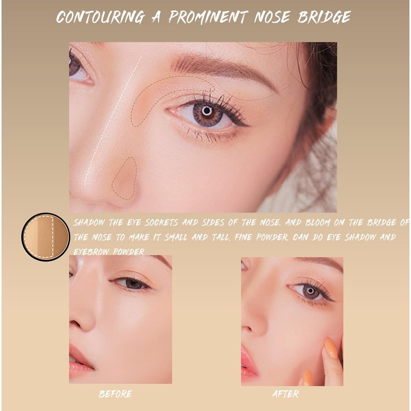 - 【HOW TO USE】 1. Hairline: from the temple to the chin contour, making the face look slimmer. 2. Jawline: Draw contours along the mandibular and mandibular lines to shape the jawline. 3. Zygoma: Contour from temple to mouth to create clear cheekbones. 4. Both sides of the nose: From the front of the eyebrows downward to the base of the nose, create a longer, taller nose. 5. Eyelids: Swipe across the eyelid contour to make eyes appear deeper.