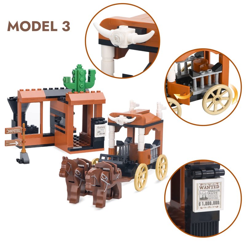 - 🐎Model 2 - Horses Stable Set - This model includes a stable, a horse, cactus, and a cart full of horse feed. The farm horse stable is decorated with horns and the wheels of the cart can be move