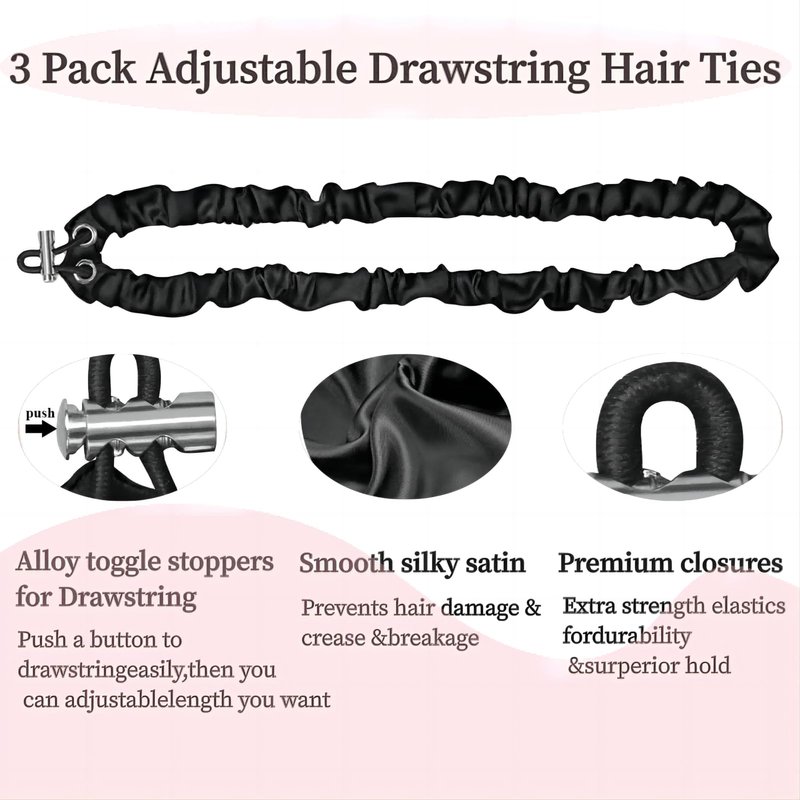 - 【Versatile and Stylish】The classic black satin adjustable hair scrunchie is perfect for everyone. These women's hair accessories will effortlessly complement any outfit and are definitely a must-have for workouts. Remember, it is excellent for keeping your hair neat while washing or applying makeup. Its unique design with textured satin and a metal cord lock also doubles as a stylish wristband.