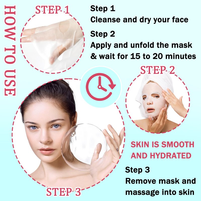 - đșăLong-lasting effectăHydrating face masks have a long-lasting moisturizing effect, using it can keep your facial skin smooth and tender for a long time, it is recommended to use it 2-3 times a week, which can make your face more glittering and charming.