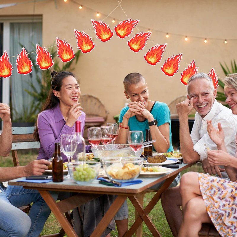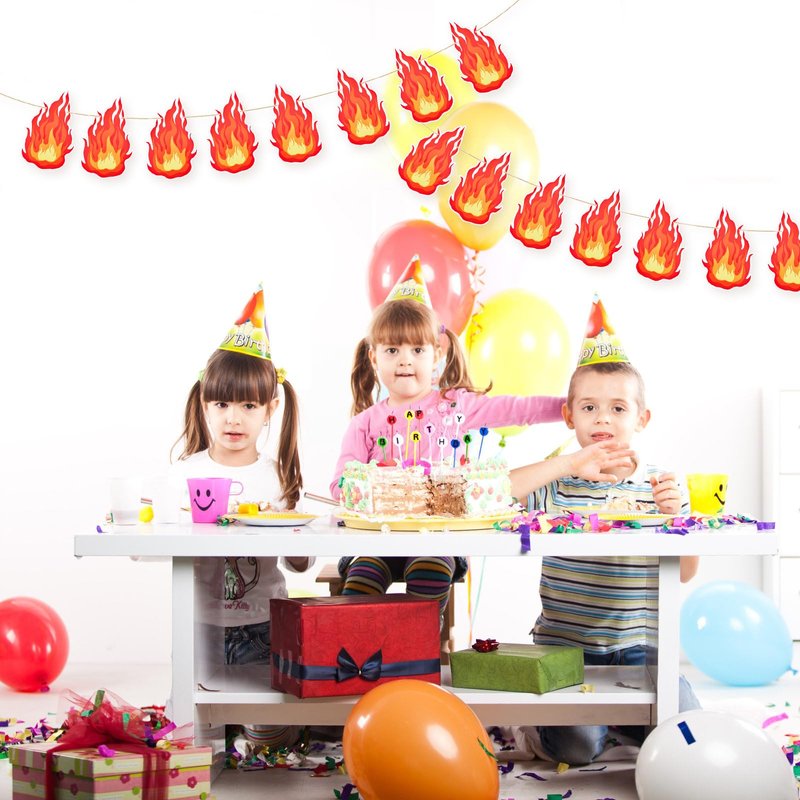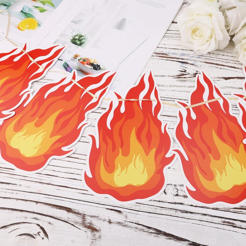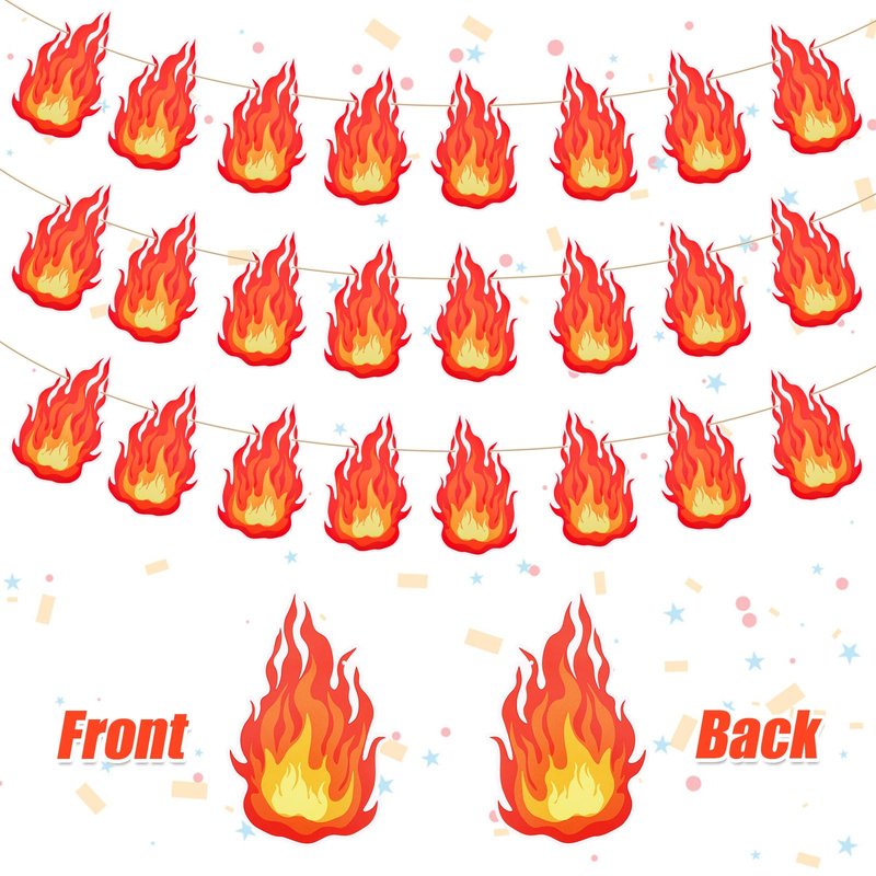 - Package Contents: You will receive 3 strings of pre-strung fire flame banners, each rope measures about 3m/9.84ft, you can flexible adjust the spacing between the fire flame card to fit your display needs, perfect to decorate your party or celebration.