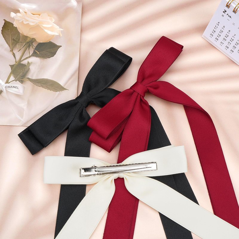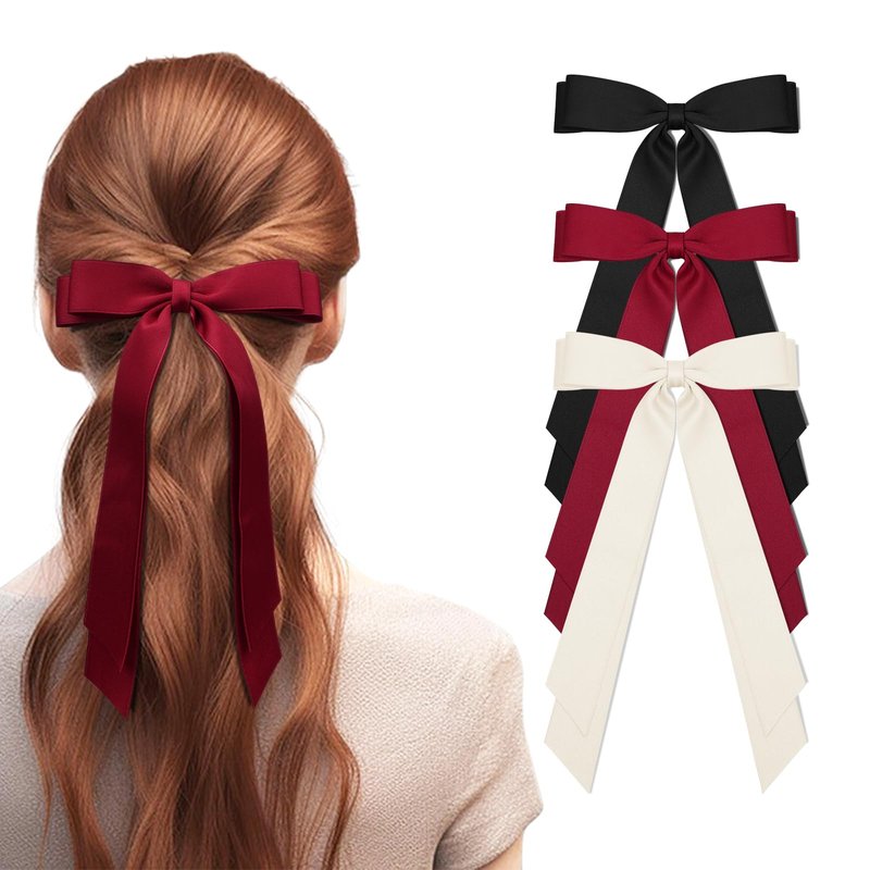 3Pcs Hair Bows Clip for Women Girls Satin Hair Ribbon Bows for Hair Long Tail French Barrettes Hair Accessories for Parties Weddings-Black/Red/Beige