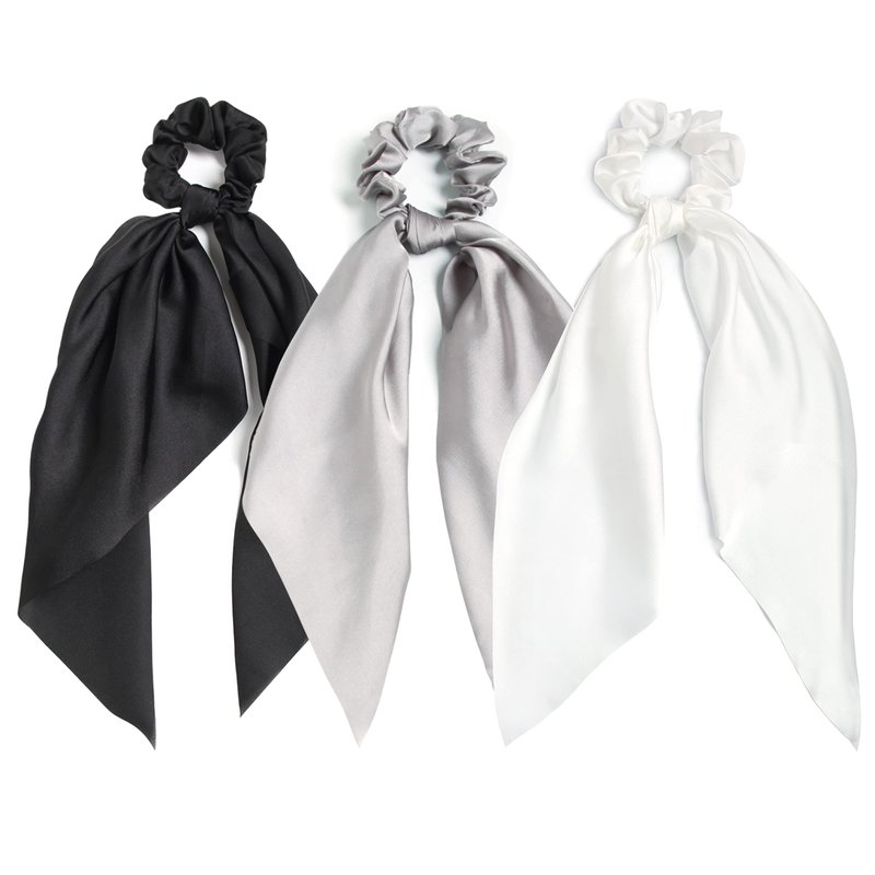 3PCS Hair Scarf Scruncheis for Women Knotted Bow Hair Ties Elastic Bands Satin Hair Ribbon Scrunchy Red Ponytail Holder for Women and Girls (Black White Gray)