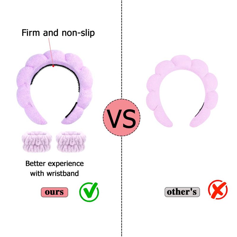 - 🌷[MATCHED PAIR] Our products include a hair band and two arm bands giving you a better experience. They are matching and the colors are the same. At the same time, they are morderately loose and won’t pinch your ears. When washing your face, skincare headbands and face washing wristbands are used together to prevent your hair from becoming wet and messy. They also stops water from sliding down to your elbows and the floor, lessening the amount of mess after washing one's face.