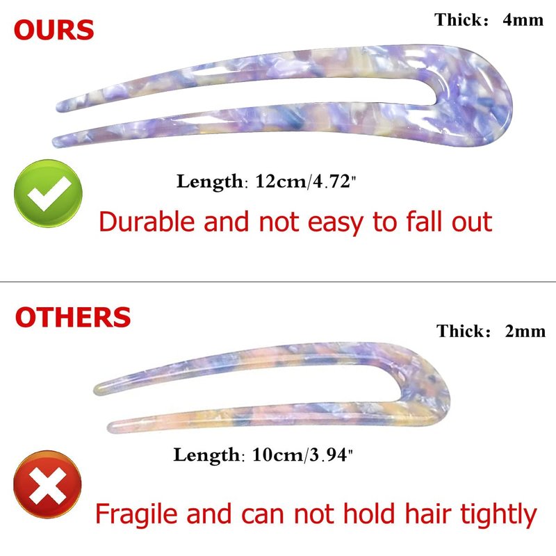 - ★【Durable & Holds Tightly】These pins are made of quality celluloid acetate, smooth and durable; The hair pins have been lengthened to 12cm/4.72inches, which can help to hold hair and not easy to fall out. The body of the pin is thickened which made it not easy to break, the pin can hold long hair tightly without slipping.