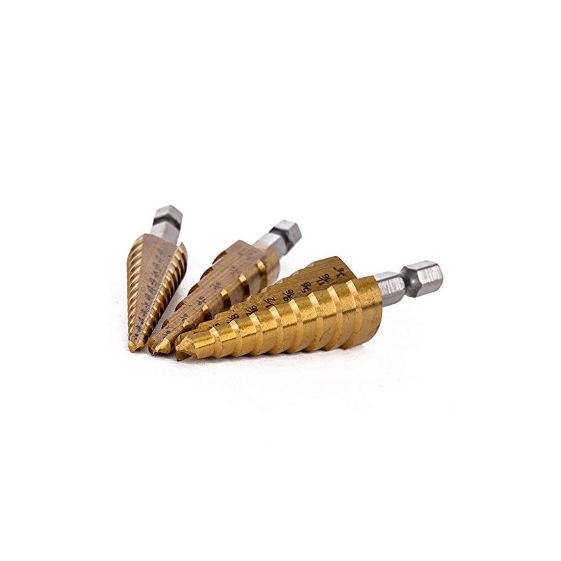 3 piece fractional, titanium coated step drill bit set with storage pouch. Step bits are a powerful ally in the workshop. Combining up to 13 drill bit sizes in one unit you can spend more time working on your project than swapping out drill bits. The dual fluted design helps keep the work area clean with improved chip removal and the cutting angle of the bits keeps your holes smooth with minimal deburring required.