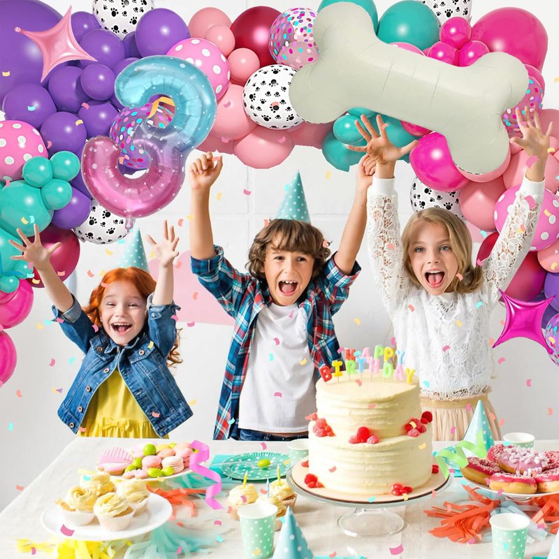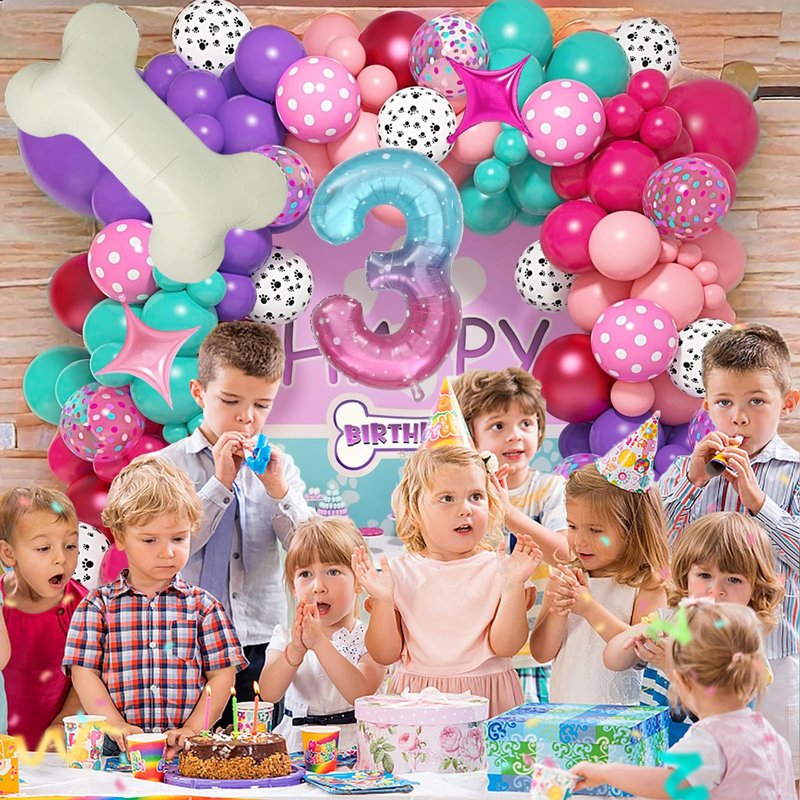 - Package content and size information:you will receive 1pcs 32 Inch 3rd Birthday Balloon and 1 bone foil balloon, 3pcs 18inch matte balloons (purple/ turquoise/ pink), 10pcs 12inch colorful confetti balloons, 22pcs 12inch balloons (pearl red/ pink polka dot/ paw print balloons), 60pcs 10inch balloons (purple/ turquoise/ pink/ rose red), 48pcs 5inch paw balloons (purple/ turquoise/ pink/ rose red),2pcs star foil balloons,10m string with four balloon accessories,Super value!