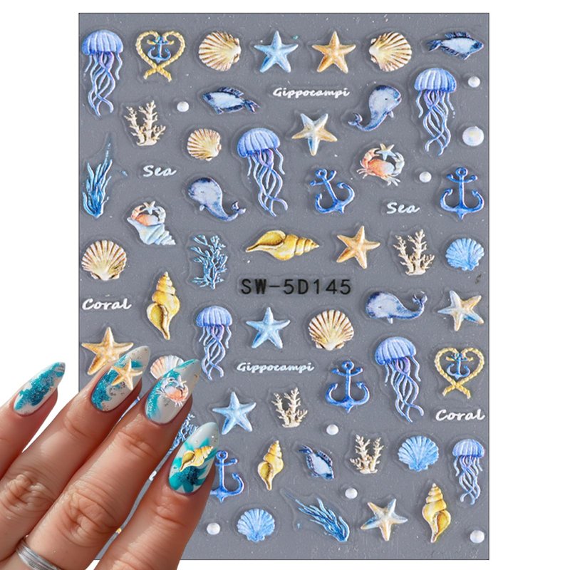 5D Ocean Style Nail Stickers Cute Sea Shell Design 5D Self-Adhesive Jellyfish Nail Supplies Nail Decals for Women DIY Manicure Accessories Gift Kit