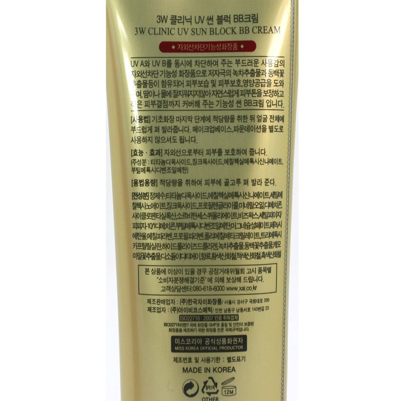 3W Clinic UV Sun Block BB Cream SPF50 PA+++Korea Cosmetics