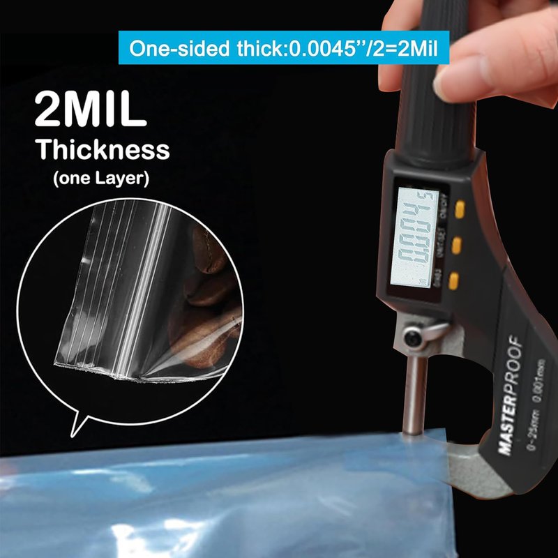 - Excellent Sealability: The size of these small plastic bags: width= 3.15'', length=4.39''. The measured double-sided thickness is 4.0 Mil (the single-sided thickness is 2 Mil=0.002"), Our small zip bags feature a premium zip that promotes long-term sealing and protects the contents inside. 100 count transparent small ziplock bag in per package