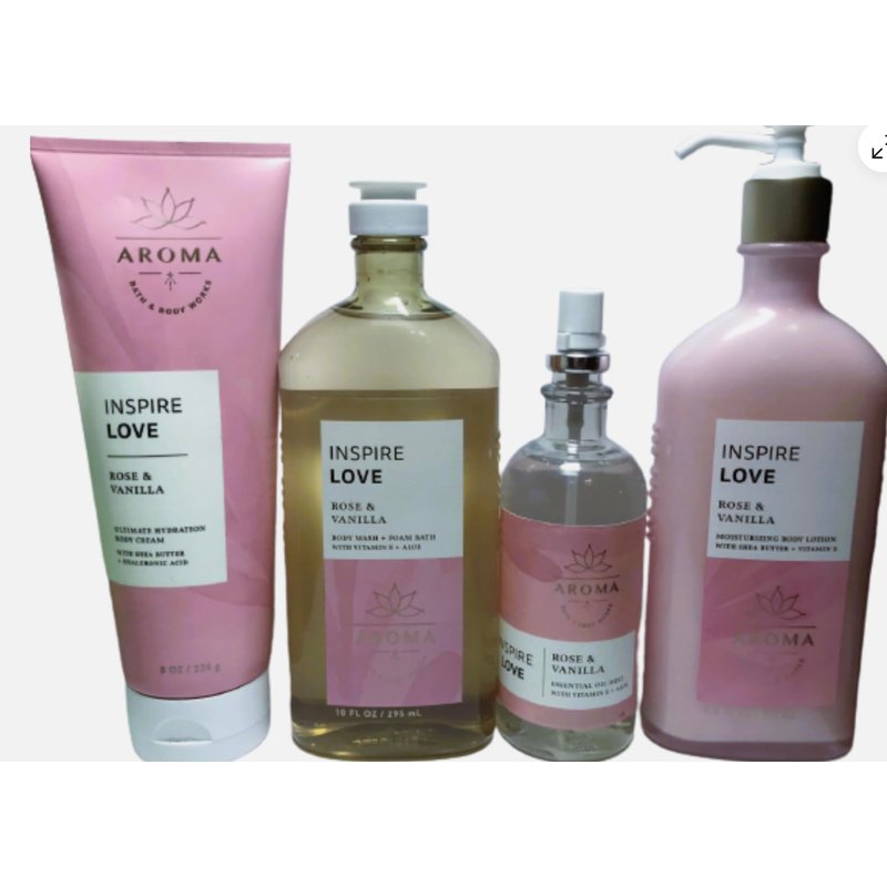 4 Aromatherapy Inspire Love Rose & Vanilla bath Body Cream Body Lotion Body Wash Essential Oil Mist set