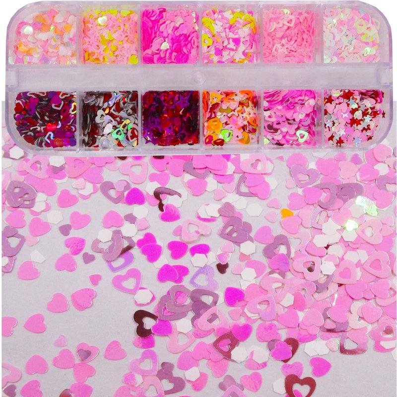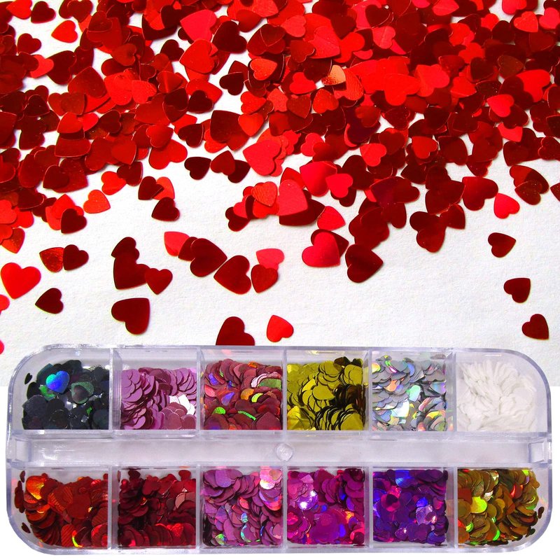 - Heart chunky glitter sequins works great for your gel nail art,acrylic nails,and suitable for decorating your wallet, bags, shoes, dress, cell phone case, printing,body art painting, face and eye makeup, snowglobe, tumblers, festival, jewelry making with resin epoxy, kids slime making, handmade crafts works,Christmas ornaments etc.