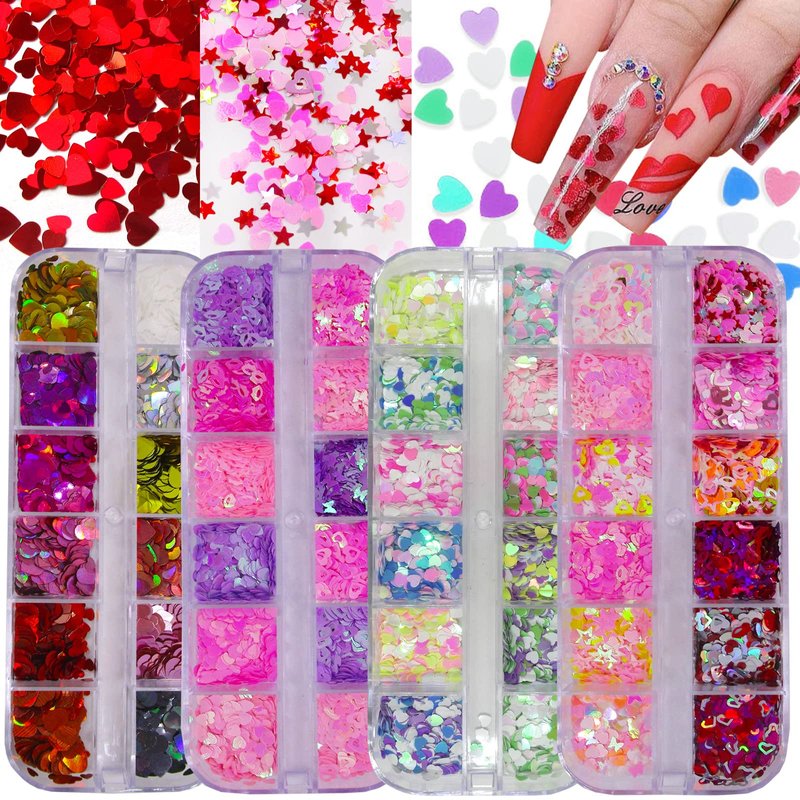 - Valentine nail glitter sequins set includes 1 box neon hallow heart glitter flakes, 1 box holographic heart glitter sequins,2 boxed mixed heart butterfly stars lips glitter confetti and 1pc tweezers applicator manicure crafts tools, perfect for various sparkling crafts or nails, makeup needs.