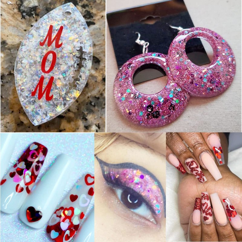 - LoveOurHome valentine theme nail glitter flakes made of quality pigment which are cosmetic gradecan be applied on your face, body, hair, beard, eye shadow, lips, cheeks, makeup, nail art,etc. They will not dull, fade color,can pour into adhesive to epoxy resin works, or use with gel x and hard gel for acrylic nail design.