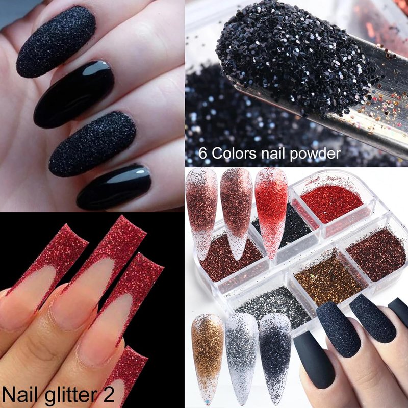 - Nail Art Powders:Quantity,1 Box,6 Colors:Lasers red,Lasers silver,Lasers black,Lasers gold,Lasers brown,Lasers light brown.Effect: Holographic Flash.Gradient Design:Apply more powder to the front of your nails, and less toward the base to make a gradient effect.Note: the glitter must be scattered on the base oil is not dry, because that can stick.