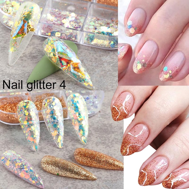 - DIY Glitter Nail Art Kits:You will get 4 Boxes nail art sequins powder,6 colors/box,The kit includes a variety of glitter shades,allowing you to create unique and eye-catching nail designs.Unleash your creativity with this DIY glitter nail art kit, perfect for adding sparkle and shine to your nails.