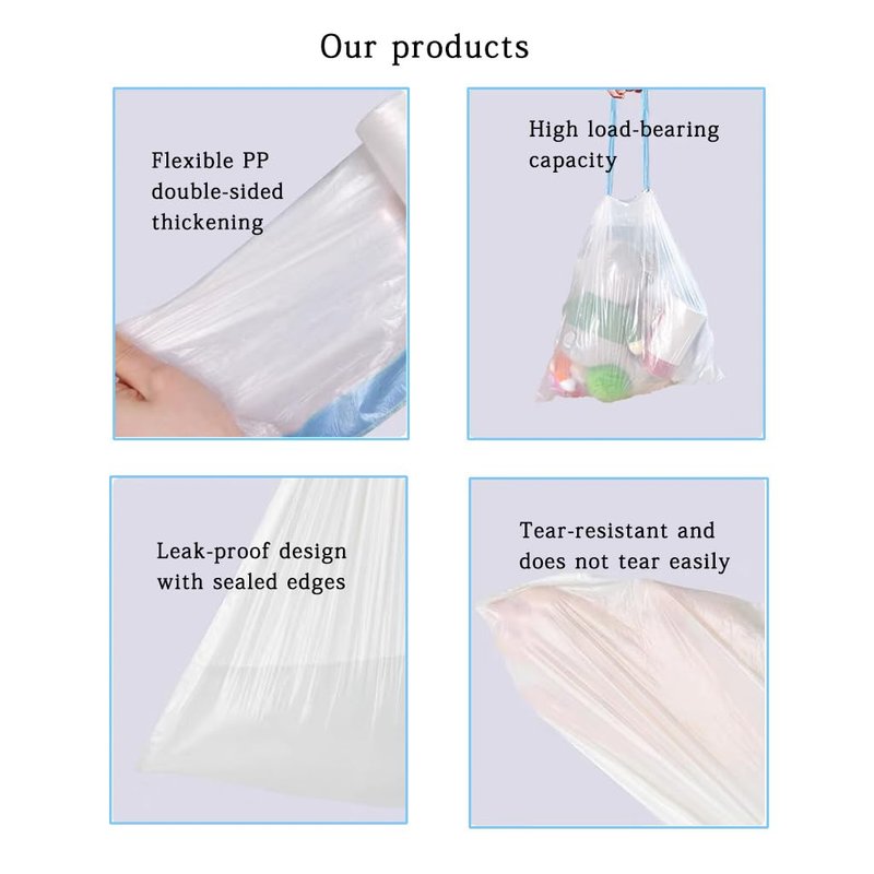 - Drawstring Trash Bags Material: These small garbage bags use only Pure PE material for your safety and health. The small trash bags are durable enough to prevent rip, leak-proof, anti-puncture, stretchy.