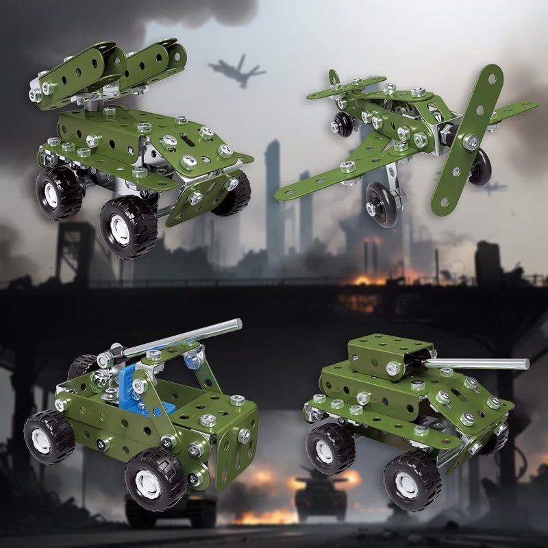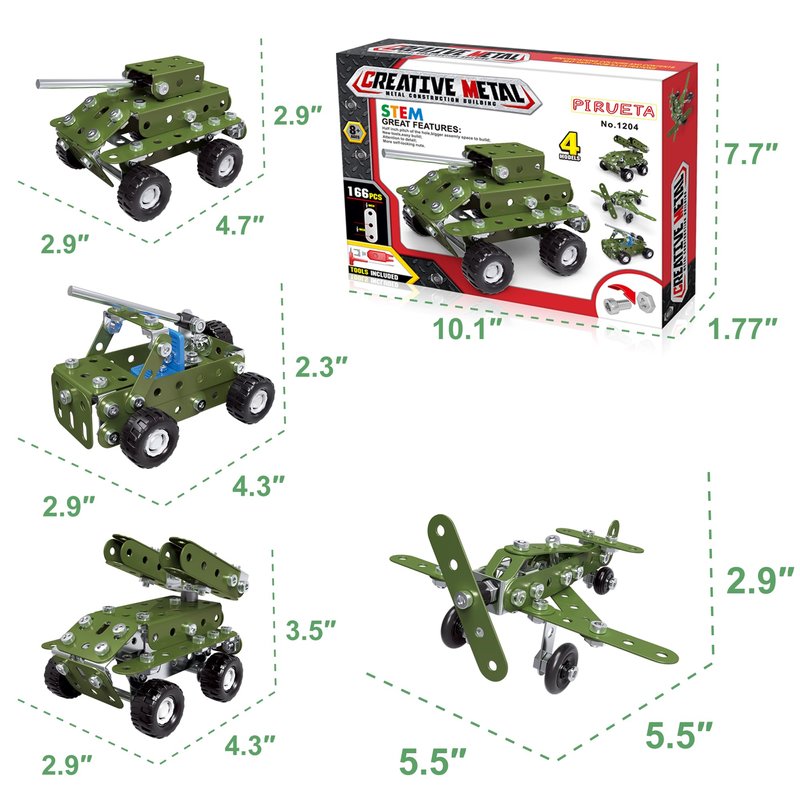 PIRUETA Metal Building Toys 4 in 1 Military Model Set For Kids Ages 8-16, Which Simulation Design And Clear Instructions Can Completely Keep Your Children Busy And Entertained For Hours! ► Realistic Detail Design Compared with the plastic version, we use metal material to make it more realistic and firm. ► With Wrench And Screwdriver & Clear Instructions We have equipped a wrench and a screwdriver to make it easier for children to assemble. In addition, you don’t have to worry about assembling toy that is too difficult for your children. We also have prepared clear instructions for the children and everything is clearly marked. Trust me, For children, assembling this building set will get a great sense of accomplishment.